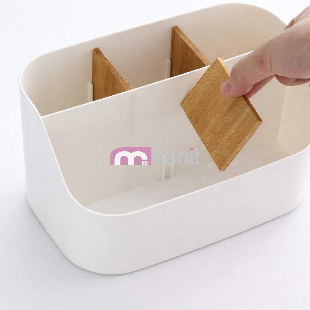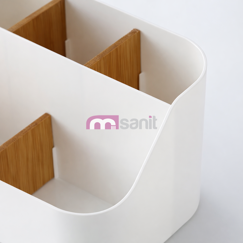 Duży organizer z przegródkami na blat łazienkowy biały + drewno
