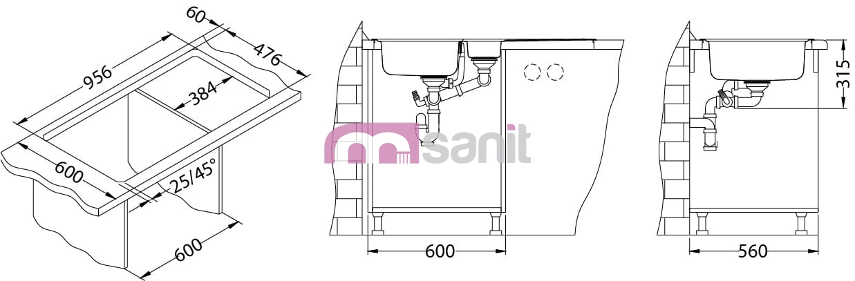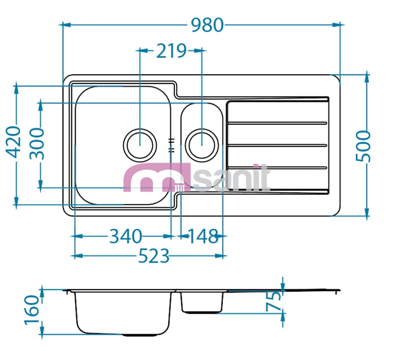 LINE 10 SAT Standard 98x50 1 1/2K zlew wpuszczany z odpływem zatyczkowym fi114 z syfonem