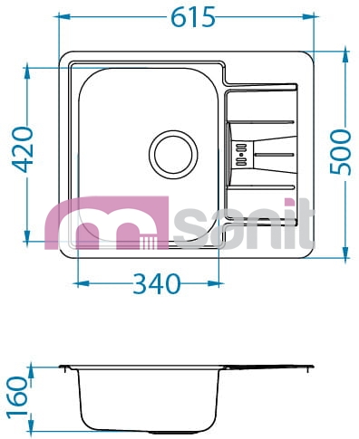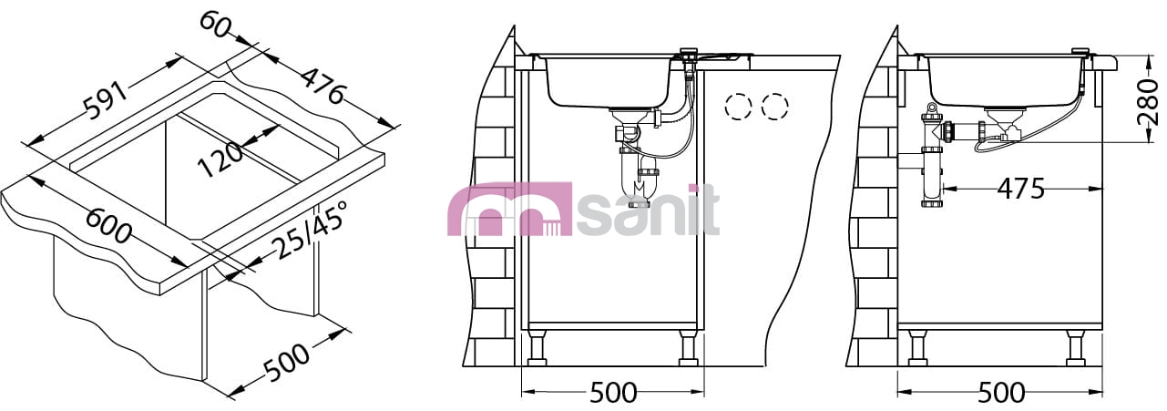 LINE 60 SAT Standard 61,5x50 1K zlew wpuszczany z odpływem zatyczkowym fi114 z syfonem