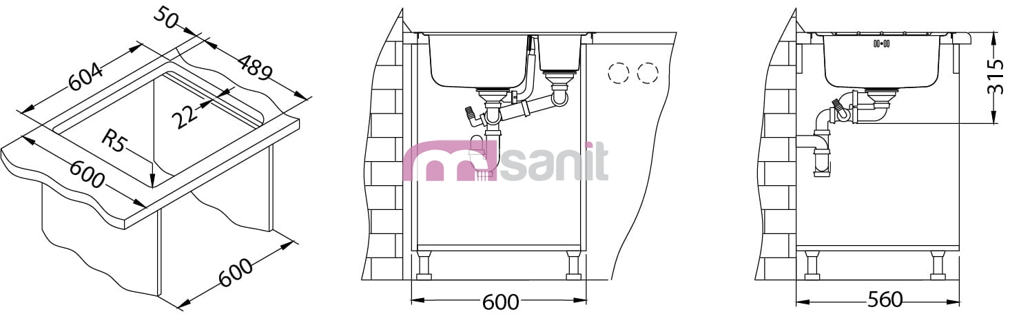 LINE MAXIM 50 SAT FS 615x500 1 1/2 zlew wpuszczany i na równi z blatem z syfonem pop up