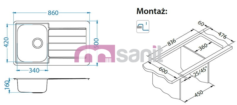 Wymiary zlewozmywaka: 860X500