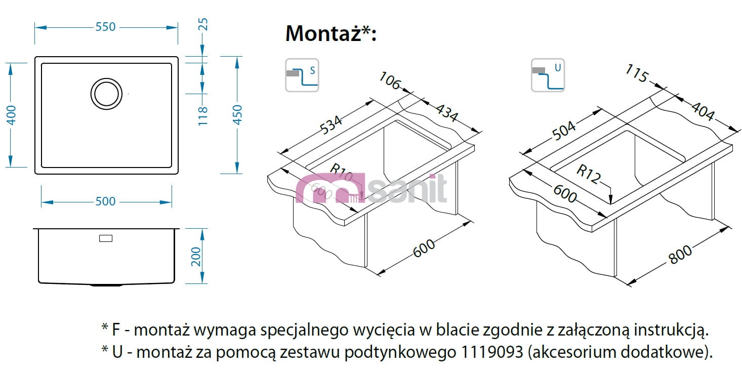 Wymiary zlewozmywaka: 550x450