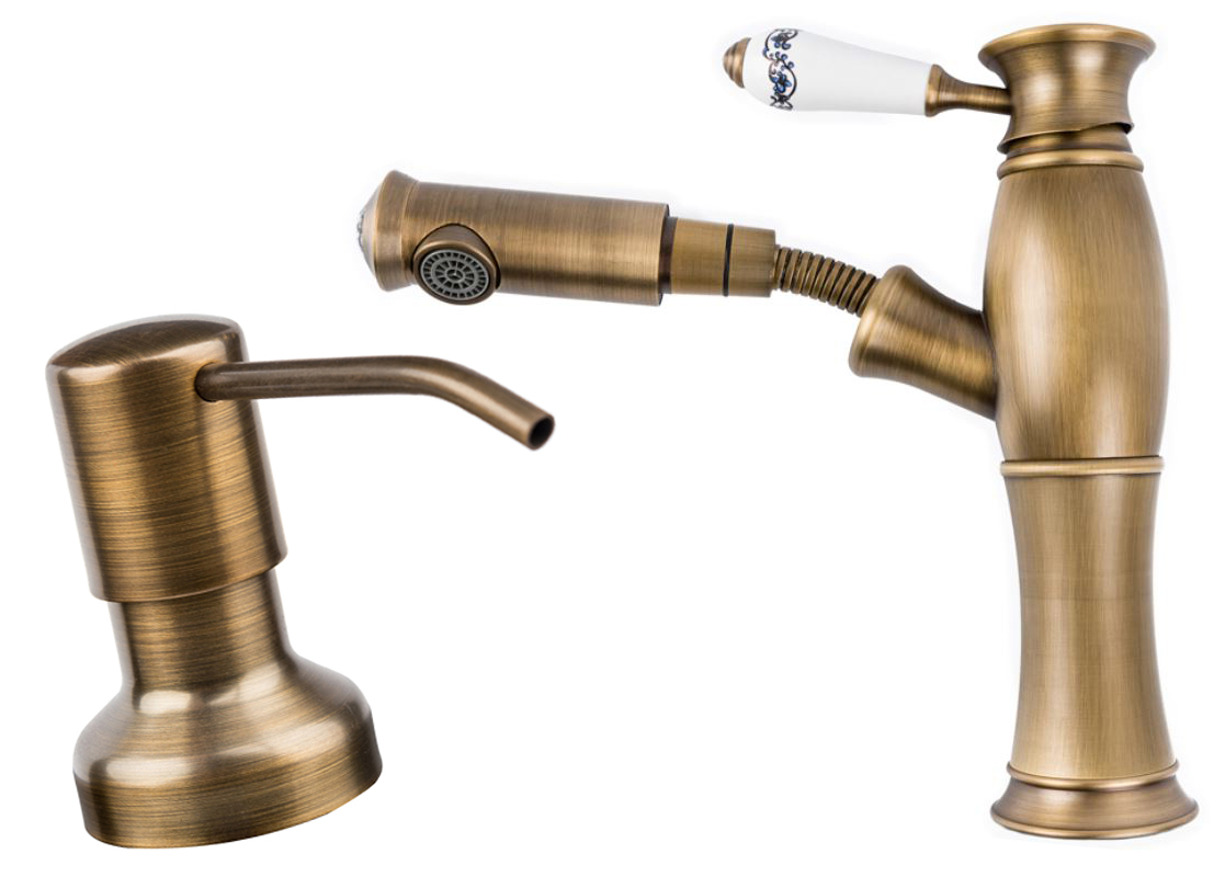 RETRO 110 bateria kuchenna z wyciąganą wylewką w kolorze stare złoto + dozownik płynów